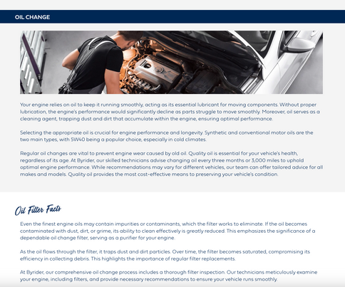 Website design refresh for Byrider Wisconsin’s service website. This project employed a structured grid system to maintain visual consistency, featured updated imagery to enhance appeal, and adhered to the company’s branded color palette. The refreshed layout emphasized clear organization, intuitive navigation, and an overall improved user experience to ensure ease of use for customers.